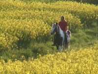 Casey reitet er an blühenden Rapsfeldern entlang – ohne Sattel,
